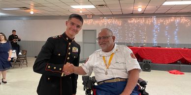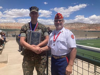 MCL Det.#1316 Judge Advocate Adrian Glass presents an award to Cadet Major Ryan Casey on May 9th, 2024 at the Rio Rancho High School MC JR-ROTC Ceremony